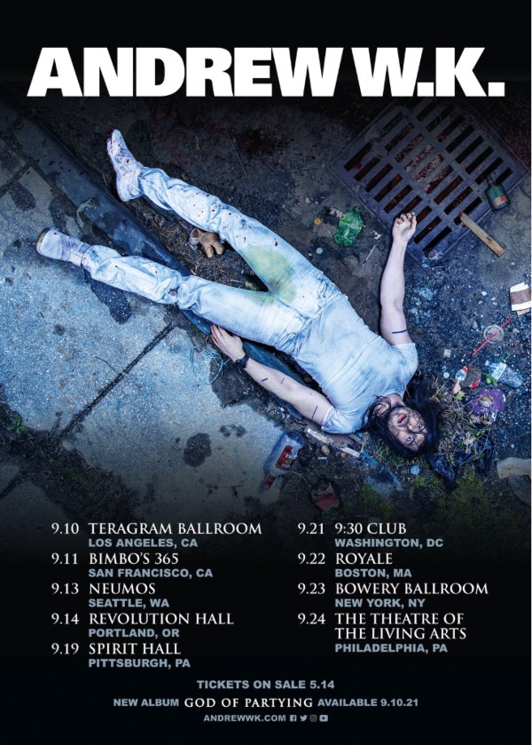 Hovering in the fluorescent spotlight of his legendary party power, God Is Partying sees ANDREW W.K. ransack the corners of the human psyche, reaching a triumphant apex in his catalog. Emotive yet steadfast, ominous yet invigorating, God Is Partying embraces both the break-ups and break-downs of life, and ANDREW W.K. once again provides his audience with the perfect soundtrack to celebrate life in all its perplexing and euphoric intensity. Showcasing his indisputable musicality, God Is Partying features ANDREW W.K. performing all of the album’s instruments, in addition to co-producing the album with his long-time recording partner, Grammy Award-winning engineer, Ted Young.
