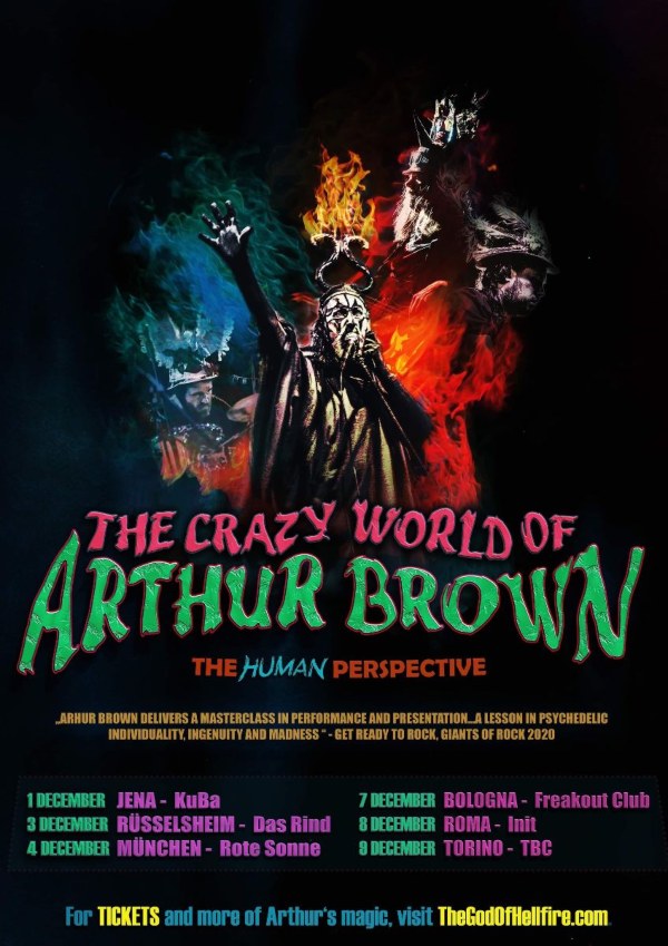 Arthur Brown writes: “People of Earth, I am the God of Hellfire, and I bring you… THE CRAZY WORLD OF ARTHUR BROWN tour in 2025!”, the rock pioneer exclaims. “We are setting forth on a blazing journey through the UK and beyond, conjuring visions, bending reality, and summoning the eternal fire that fuels our crazy world. Prepare yourselves for an odyssey of sound and spectacle! But wait! Beyond the veil of the known, deep within the ancient, echoing cavern of the Balver Höhle, we shall descend into the abyss of myth and mystery at Prophecy Fest! There, where shadows dance and time itself distorts, we will channel the primeval forces that have whispered through the stones for millennia… and unleash a performance unlike any other! But this, dear seekers of fire and revelation, is only the beginning! More dates shall be revealed… “