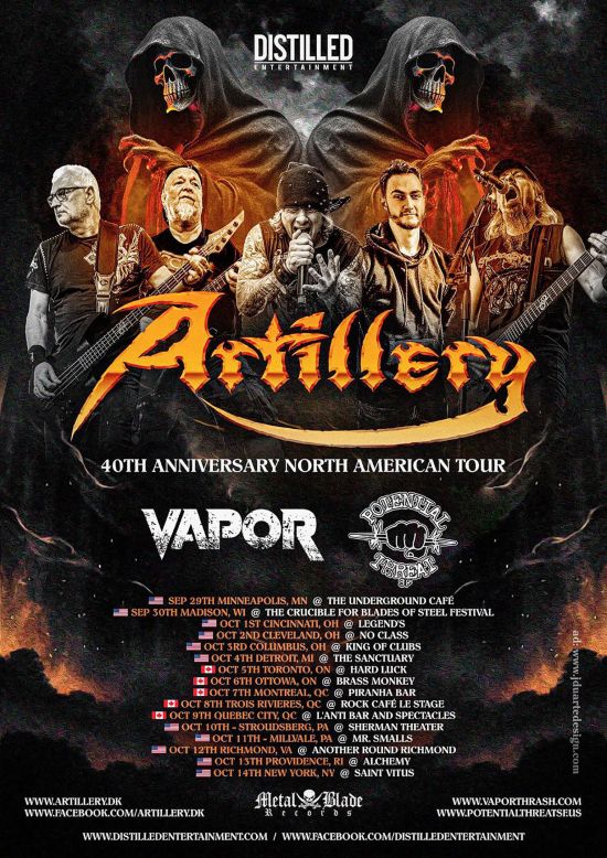 ARTILLERY guitarist Michael Stutzer comments, “We are really excited to get back to North America to celebrate 40 years of ARTILLERY’s thrash metal. We had an amazing time on our last tour and can’t wait to meet our diehard fans again.“