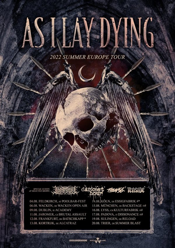 Confirmed dates for AS I LAY DYING’s “Two Decades Of Destruction” European 2022 Tour with DYING FETUS and EMMURE are: 19.03.2022 DE Saarbrücken – E-Werk 20.03.2022 FR Paris Elysée – Montmartre 22.03.2022 FR Toulouse – Le Bikini 23.03.2022 EP Barcelona – Raz/ zmatazz 1 24.03.2022 EP Madrid – La Rivera 25.03.2022 PT Lisbon – Sala Tejo 26.03.2022 SP Bilbao – Santana27 28.03.2022 FR Lyon – Transbordeur 29.03.2022 DE Würzburg – Posthalle 30.03.2022 NL Tilburg – 0 1 3 01.04.2022 DK Copenhagen – Vega 02.04.2022 SE Gothenburg – Trädgårn 03.04.2022 NO Oslo – Rockefeller 04.04.2022 SE Stockholm – Fållan 06.04.2022 FI Tampere – Pakkahuone 08.04.2022 FI Helsinki – House Of Couture 09.04.2022 EE Tallinn – Helitehas 10.04.2022 LA Riga – Palladium 12.04.2022 PL Warsaw – Progresja 13.04.2022 CZ Prague – Roum Karlin 14.04.2022 HU /Budapest – Barba Negra 15.04.2022 SK Bratislava – Rafinery Gallery 16.04.2022 AT Vienna – Arena Impericon Festival ** 17.04.2022 CH Zürich – X-tra Impericon Festival ** 19.04.2022 IT Milan – Alcatraz ** 20.04.2022 IT Rome – Orion ** 22.04.2022 DE Munich – Zenith Impericon Festival ** 23.04.2022 DE Leipzig – Messe Impericon Festival ** 24.04.2022 DE Oberhausen – Turbinenhalle Impericon Festival ** ** W/ FIT FOR A KING (No DYING FETUS)