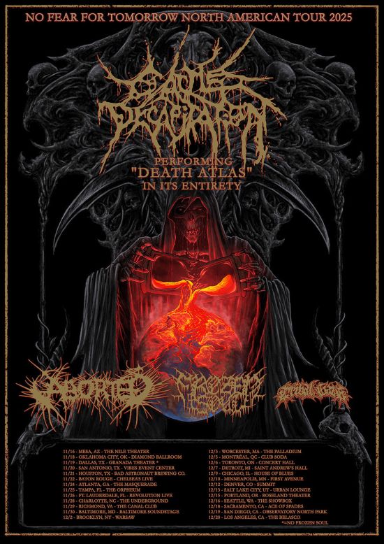 West Coast deathgrind icons CATTLE DECAPITATION have confirmed a North American headlining tour this Fall. The No Fear For Tomorrow Tour begins November 16th and runs through December 20th. Support will be provided by Aborted, Frozen Soul, and Tribal Gaze. The journey will see CATTLE DECAPITATION perform their critically-lauded Death Atlas full-length in its entirety!