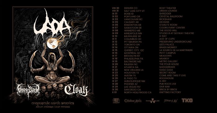 Dates w/ Uada and Ghost Bath 08/30 Denver, CO @ Roxy Theater [TICKETS] 08/31 Salt Lake City, UT @ Urban Lounge [TICKETS] 09/01 Boise, ID @ Shredder [TICKETS] 09/02 Portland, OR @ Crystal Ballroom [TICKETS] 09/03 Vancouver, BC @ Rickshaw [TICKETS] 09/05 Calgary, AB @ Dickens [TICKETS] 09/06 Edmonton, AM @Starlite Room [TICKETS] 09/07 Saskatoon, SK @ Coors Event Center [TICKETS] 09/08 Winnipeg, MB @ The Good Will [TICKETS] 09/09 Minneapolis, MN @ Skyway Theatre [TICKETS] 09/10 Milwaukee, WI @ X-Ray [TICKETS] 09/11 Columbus, OH @ Ace of Cups [TICKETS] 09/12 Pittsburgh, PA @ Preserving Underground [TICKETS] 09/13 Toronto, ON @ Lee’s Palace [TICKETS] 09/14 Ottawa, ON @ Brass Monkey [TICKETS] 09/15 Quebec City, QC @ La Source De La Martiniere [TICKETS] 09/16 Montreal, QC @ Petit Campus [TICKETS] 09/17 Brooklyn, NY @ Meadows [TICKETS] 09/18 Philadelphia, PA @ Milkboy [TICKETS] 09/19 Baltimore, MD @ Metro Gallery [TICKETS] 09/20 Raleigh, NC @ The Pour House [TICKETS] 09/21 Atlanta, GA @ Masquerade [TICKETS] 09/22 New Orleans, LA @ Gasa Gasa [TICKETS] 09/23 Houston, TX @ Secret Room [TICKETS] 09/25 Austin, TX @ Come and Take It Live [TICKETS] 09/26 El Paso, TX @ Rockhouse [TICKETS] 09/27 Albuquerque, NM @ El Rey [TICKETS] 09/28 Phoenix, AZ @ Pub Rock Live [TICKETS] 09/29 Las Vegas, NV @ Dive Bar [TICKETS] 09/30 San Diego, CA @ Brick By Brick [TICKETS] 10/01 North Hollywood, CA @ Knitting Factory [TICKETS]