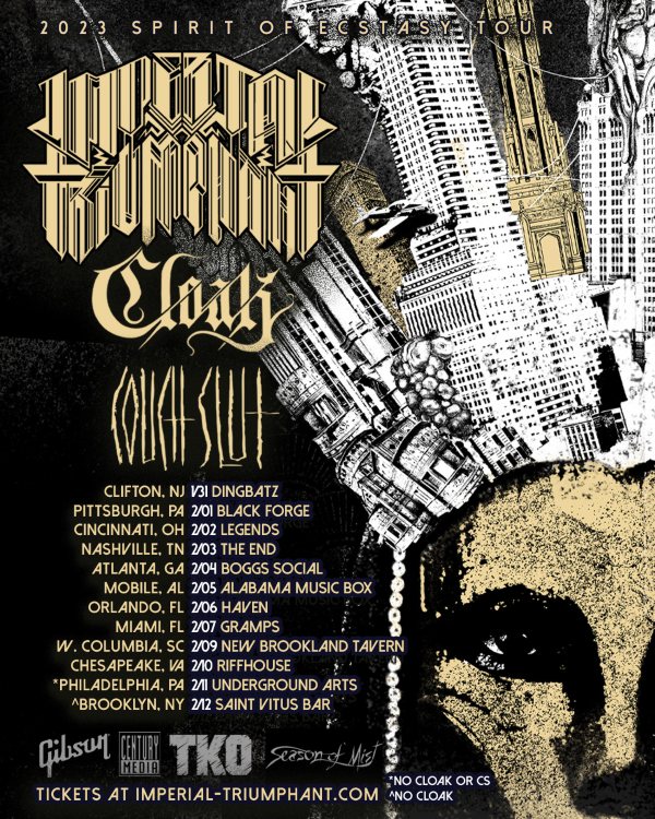 CLOAK (w/ IMPERIAL TRIUMPHANT + COUCH SLUT): 01/31: Clifton, NJ @ Dingbatz [TICKETS] 02/01: Pittsburgh, PA @ Black Forge [TICKETS] 02/02: Cincinnati, OH @ Legends [TICKETS] 02/03: Nashville, TN @ The End 02/04: Atlanta, GA @ Boggs Social [TICKETS] 02/05: Mobile, AL @ Alabama Music Box 02/06: Orlando, FL @ Haven [TICKETS] 02/07: Miami, FL @ Gramps [TICKETS] 02/09: W. Columbia, SC @ New Brookland Tavern [TICKETS] 02/10: Chesapeake, VA @ Riffhouse [TICKETS]