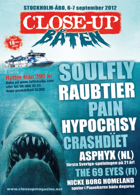 SOULFLY, HYPOCRISY and PAIN have been added to the Close-Up Båten cruise, which will leave the Stockholm, Sweden port on September 6 for Åbo, Finland, and return the following day. Also scheduled to appear are ASPHYX, CRASHDÏET, THE 69 EYES, NICKE BORG HOMELAND and RAUBTIER.