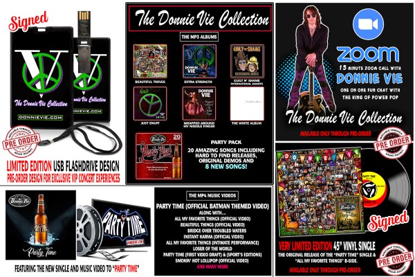 Donnie Vie talking about his new box set “The Donnie Vie Collection”, “This is a collection of the 5 studio records I’ve released as a solo artist. And a 6th record worth of new, unreleased songs that are snatched right out of my home studio demo collection. They may not be all dressed up in fancy wrappers but they taste the same. If you are already a Donnie Vie fan you will appreciate these all being rounded up and put on one new, modern format listening medium, being flash drive ( which also doubles as a VIP laminate to be used at my upcoming live concerts for meet ‘n’ greets), as some of these records aren’t easy to find. Plus, you’ll also really love these new songs that you’ve never heard, including the new single and video ” Party Time”. If I do say so myself this is a very cool thing to have as I enjoyed listening to it myself. Thank you my sisters and brothers, and I’ll be seeing y’all real soon.”