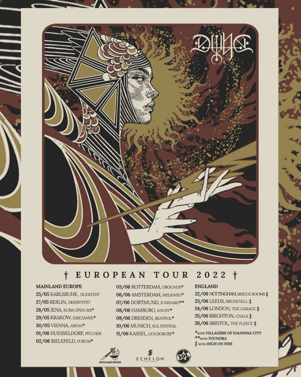 DVNE On Tour 2022 01.05. London, Desertfest (Roundhouse) 25.05. Karlsruhe, Dudefest 27.05. Berlin, Desertfest 28.05. Jena, Kuba Open Air 29.05. Krakow, Zascianek* 30.05. Vienna, Arena* 01.06. Dusseldorf, Pitcher 02.06. Bielefeld, Forum* 03.06. Rotterdam, Grounds* 06.06. Amsterdam, Melkweg* 07.06. Dortmund, Junkyard 08.06. Hamburg, Knust* 09.06. Dresden, Beatpol* 10.06. Munich, Sounds of Liberation Fest 11.06. Kassel, Goldgrube* (*w/ Villagers of Ioannia City)