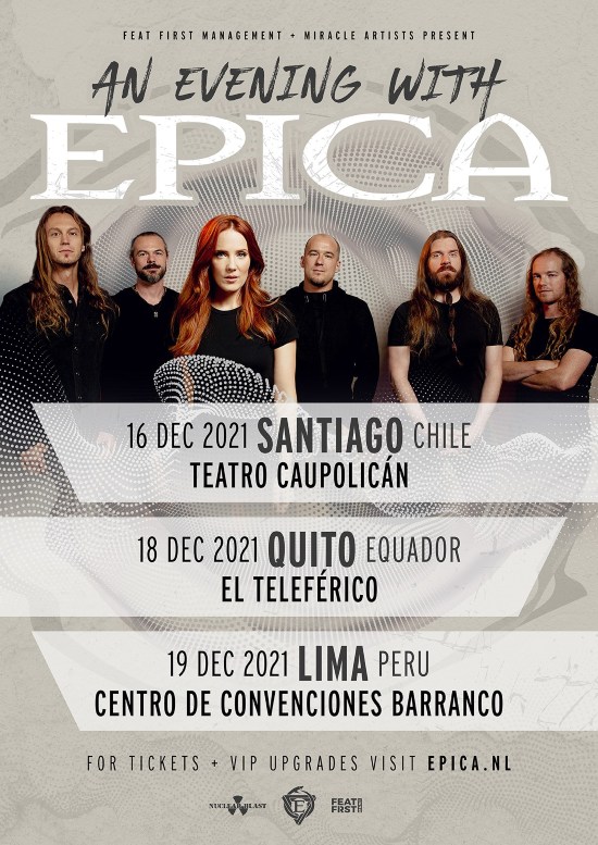 An Evening with EPICA 16.12.2021 Teatro Caupolican, Santiago Chile 18.12.2021 El Teleferico – Quito, Ecuador 19.12.2021 Centro de Convenciones Barranco – Lima, Peru