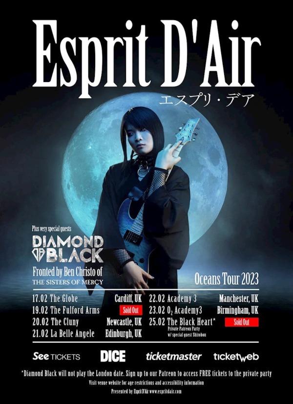Esprit D’Air released their second album, Oceans in 2022, which included collaborations with members of the iconic gothic rock group The Sisters of Mercy and Japanese metalcore band Crystal Lake, plus remixes by Heavygrinder, and Shirobon. Oceans has received support and praise from Loudwire, Kerrang! Radio, as well as from members of Cradle of Filth, The Sisters of Mercy, Vallenfyre, and The Birthday Massacre. Esprit D’Air’s most recent release saw the Japanese artist collaborate on a new version of the track 雫 (‘Shizuku’) in collaboration with Australian producer Misstiq.