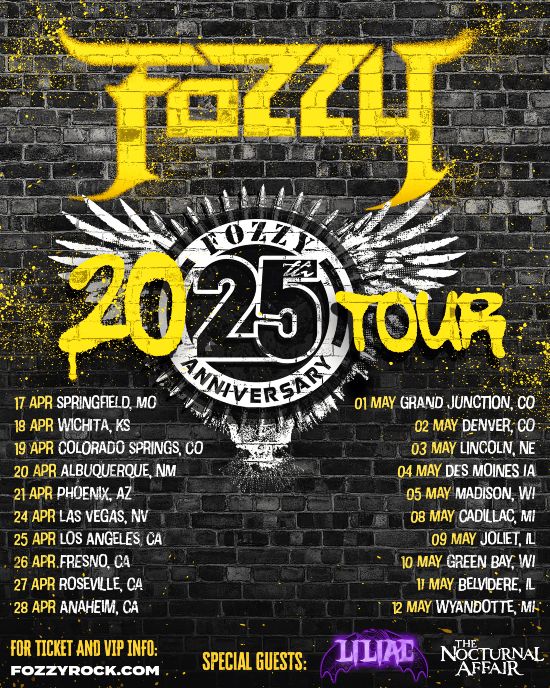Featuring Superstar showman Chris Jericho on vocals tagging with the iconic signature riffs of maven guitarist Rich Ward, FOZZY is set to launch the next phase of their 25th Anniversary tour with guitarist Billy Grey, bassist P.J. Farley, and drummer Grant Brooks rounding out the band.