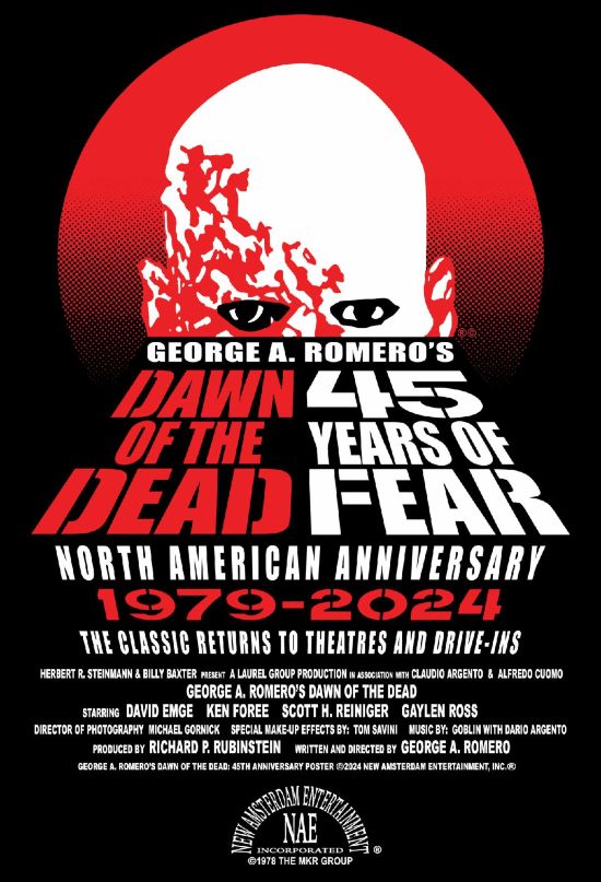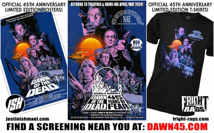 New Amsterdam Entertainment Inc.® is proud to announce George A. Romero’s ‘Dawn of the Dead’ will be celebrating the 45th Anniversary of its North American debut with a blow-out celebration event! The definitive zombie classic returns to both Theatresand Drive-Ins for screenings across the U.S. and Canada from April-May, 2024, with very special official anniversary collectables coming from FRIGHT-RAGS and ISH! The previously announced big-screen return has updated and revised the listings, which can be found at THIS LOCATION.