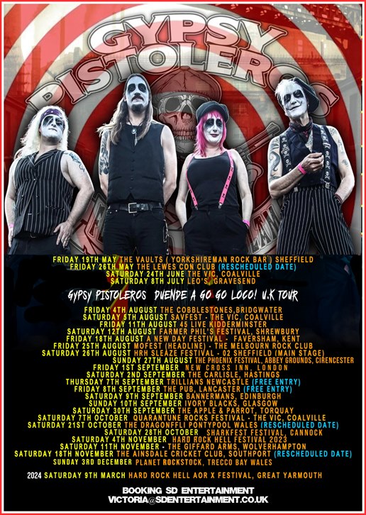 The Gypsy Pistoleros have always had a reputation for danger and played five Rocklahoma festivals 2007-11, in Oklahoma, USA , where they appeared alongside Motley Crue, Guns n Roses, Poison, ZZ top, Twisted sister, Faster Pussycat, Vain, Papa Roach, Whitesnake, Skid Row, Black Label Society. Normally closing each night!