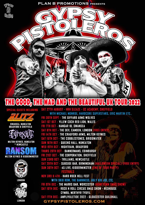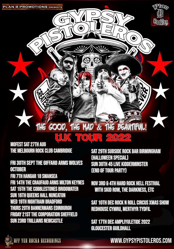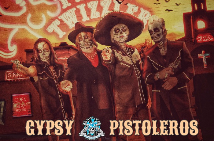 Gypsy Pistoleros may be best described as being the ideal house band for the fictitious Titty Twister bar of Rodriguez’s From Dusk Til Dawn. Between the nods to Morricone’s tense, tumbleweed atmospheres and the Gypsy Kings’ manic Latin energy, a New York Dolls raw glam-punk spark and a surplus of prime G ‘n’ R attitude!