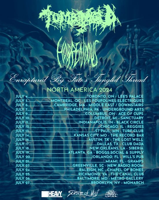 Tomb Mold and Horrendous Enraptured By Fate’s Tangled Thread Tour July 4 – Toronto, ON @ Lee’s Palace July 5 – Montreal, QC @ Les FouFounes Electriques July 6 – Cambridge, MA @ Middle East / Downstairs July 7 – Philadelphia, PA @ Underground Arts July 9 – Columbus, OH @ Ace of Cups July 10 – Detroit, MI @ Sanctuary July 11 – Indianapolis, IN @ Black Circle July 12 – Chicago, IL @ Reggies July 13 – St. Paul, MN @ Turf Club July 14 – Kansas City, MO @ The Record Bar July 16 – Austin, TX @ The Lost Well July 17 – Dallas, TX @ Club Dada July 18 – New Orleans, LA @ Siberia July 19 – Atlanta, GA @ Boggs Social & Supply July 20 – Orlando, FL @ Will’s Pub July 21 – Miami, FL @ Gramps July 23 – Greenville, SC @ New Radio Room July 24 – Raleigh, NC @ Chapel of Bones July 25 – Richmond, VA @ The Canal Club July 26 – Baltimore, MD @ Metro Gallery July 27 – Brooklyn, NY @ Monarch