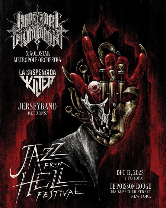 Steve Blanco (bass, keyboards) comments: “Imperial Triumphant drags the city’s underbelly into Le Poisson Rouge for Jazz From Hell — horns ablaze, brass dripping in decadence, a golden chaos where dissonance swings and the city trembles. This is Jazz from Hell dressed in gold and filth!”