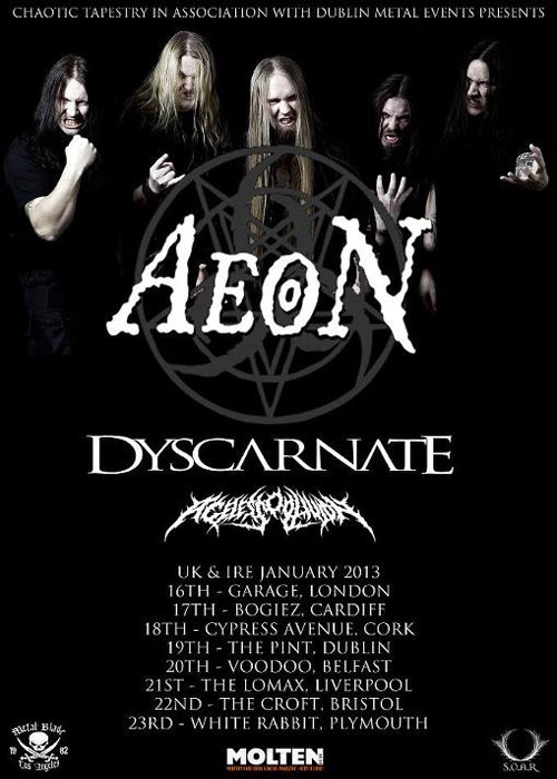 Swedish technical death metal band, AEON, is pleased to announce their January tour taking the band through the UK and Ireland. Dyscarnate and Ageless Oblivion will be supporting AEON on the tour that runs from January 16 through the 23, in conjunction with AEON’s upcoming new full-length album due to come out on Metal Blade Records this fall. More info coming soon!