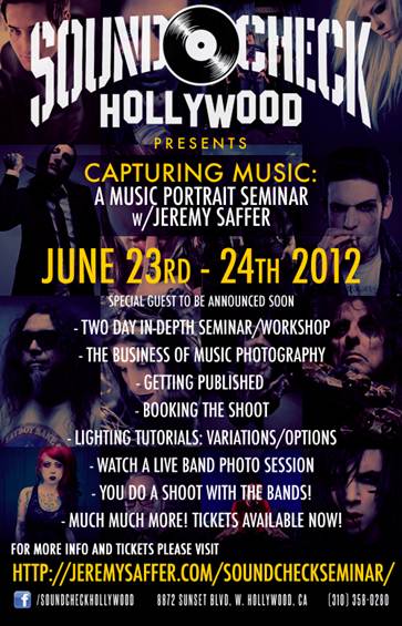 After a successful month of spearheading photo shoots with MESHUGGAH, KILLSWITCH ENGAGE, MISS MAY I, DRAGONFORCE, OVERKILL, WATAIN, BEHEMOTH, BARONESS, and THE AGONIST, completing two back-to-back magazine cover shoots (Outburn and Hails & Horns), all the while having one cover already on shelves (Hails & Horns), photographer Jeremy Saffer will head out to Los Angeles for his first West Coast music photography seminar in conjunction with SoundCheck Hollywood.