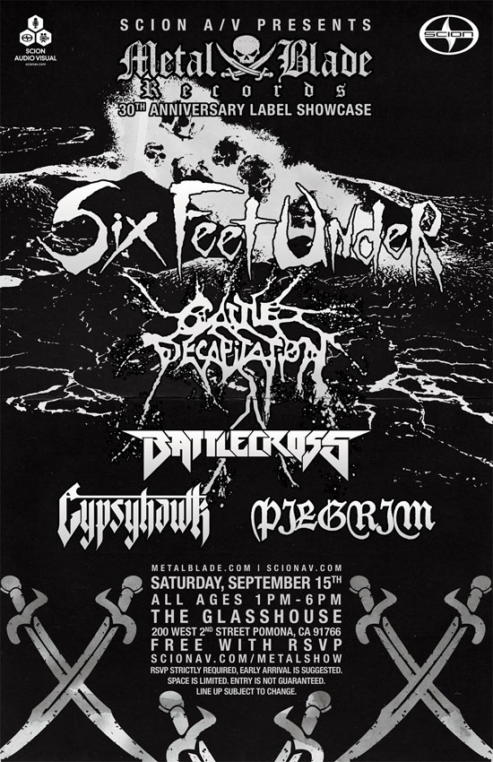 The band will be taking part in the Metal Blade Records 30th Anniversary Label Showcase, sponsored by Scion A/V Club! The showcase takes place on Saturday, September 15th at The Glasshouse in Pomona, CA. The show is free with RSVP (strictly required) and space is limited. Also performing at the show are Six Feet Under, Cattle Decapitation, Gypsyhawk, and Pilgrim. See above for the official event admat with additional details.