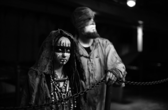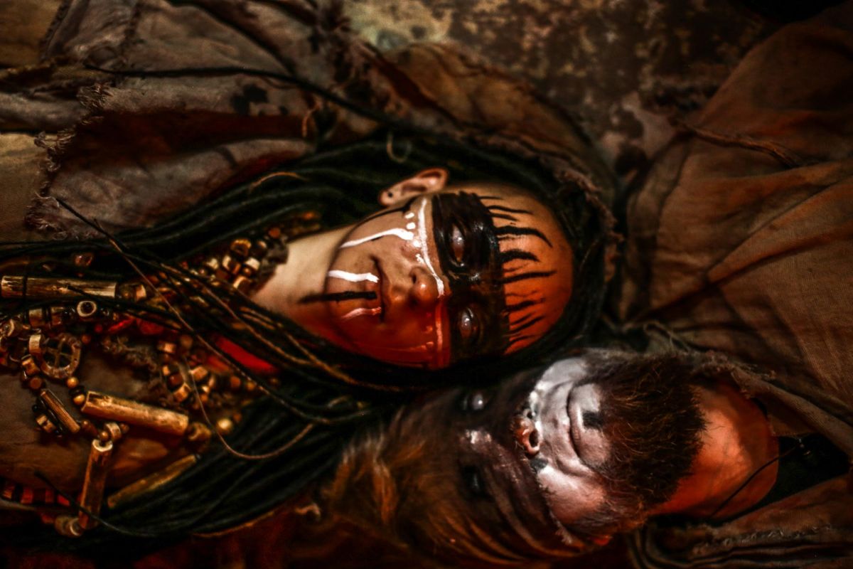 NYTT LAND’s ancient shamanic culture is palpable on songs like “U-Gra” – based on the legend of the Siberian native tribe known as Khanty. It tells the story of the guardian spirits of the tribe’s homeland as somber ritual chants at the start of the song ask the spirits to be kind to their people and help them retain their lands. An atmospheric, meditative journey accompanied by an enthralling percussive section accents the unmatched, unique throat singing layers of NYTT LAND vocalists Natasha “Baba Yaga” Pakhalenko and Anatoly “Shaman” Pakhalenko. “Svartravn” seamlessly continues this vibe while introducing melancholic string sections, telling the story of a warrior dying on the battlefield with a crow circling him, awaiting his coup de grace. The dying warrior tells the crow about his worthy life and the deeds that he performed, and that he is not afraid of death, asking the raven to take the news of his death to his family. Underlying themes on Ritual become apparent in NYTT LAND’s artistic entity, pulled together by mysterious, haunting visuals while still welcoming the listener into their spiritual world. Songs like “Dead Man’s Dance” and “Blood Of The North” showcase the Nordic folk-driven roots of NYTT LAND, while the duo takes the genre to new levels on “The Fires of Ragnarok”.