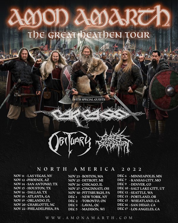 Joining Amon Amarth on their epic quest will be Carcass, Obituary and Cattle Decapitation making this *the* must-see tour for fans of death metal. Tickets go on general sale on Friday, July 15th, 2022 at 10am local from: amonamarth.com