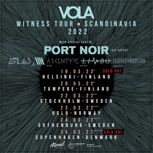 Vola Witness Tour Scandinavia 2022, Port Noir on tour support; 19.03.22 – HELSINKI (FI) 20.03.22 – TAMPERE (FI) 22.03.22 – STOCKHOLM (SE) 23.03.22 – OSLO (NO) 24.03.22 – GOTHENBURG (SE) 25.03.22 – COPENHAGEN (DK)