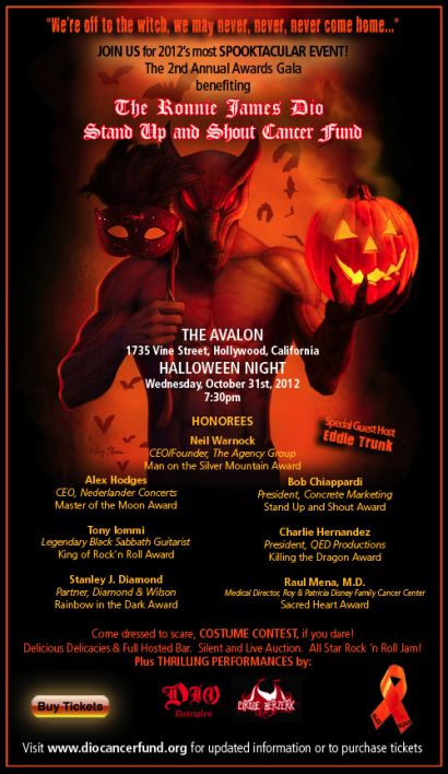 The RONNIE JAMES DIO Stand Up and Shout Cancer Fund’s second Awards Gala, set for Halloween night, Wednesday, October 31 at the Avalon nightclub in Hollywood, will include a live performance by DIO DISCIPLES, comprising former members of the band DIO, with a number of prominent rock musicians joining them on stage for an all-star jam. Among the rockers planning to join the celebrity jam session are Joey Vera (ARMORED SAINT), Billy Morrison, Glenn Hughes, Frankie Banali (QUIET RIOT), Stephen Pearcy (RATT), Joey Belladonna (ANTHRAX), Michael Sweet and Oz Fox from STRYPER, David “Rock” Feinstein, cousin of the late singer Ronnie James Dio in whose memory the Fund was created, and members of BUCKCHERRY.
