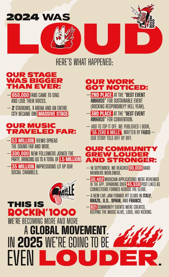 ROCKIN’1000 – The Biggest Rock Band on Earth – is the product of a crazy love for an idea and a viral video featuring 1000 musicians playing in unison. The initial goal was to convince the Foo Fighters to perform in Cesena, Italy. It worked, and the band accepted the invitation. Since then, ROCKIN’1000 has grown both as a band and a community, becoming a fearless global tribe of 100,000 music enthusiasts from all over the world. Today, ROCKIN’1000 brings rock music to stadiums across the planet, creating a unique experience that bridges the gap between musicians and spectators, celebrating music as a universal language and writing a new chapter in rock history. www.rockin1000.com – IG / FB / X / YT / LK: @rockin1000