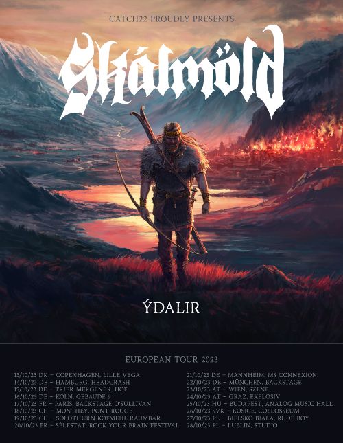 Starting off with soothing opener “Ýr“, gentle acoustic guitar and organs are the calm before the storm. Catapulted to a dwelling owned by the god Ullur, the unsettled “Ýdalir“ builds with its hypnotizing guitar rhythms and galloping drum sounds, building a solid ground for ominous and dark growls. Based on Norse mythology, the sister “Skuld” makes up a trio of Norns, responsible for deciding the fate of people. Remarkable clean tenor vocals guide through the mystic mood, breaking up the heavy horizon with a fast-paced guitar solo and underlined by eerie bass lines. Closing the album, the stunning ten-minute track “Ullur” invites the listener into a colorful journey of melodic folk metal. Accompanied by roaring fire, the lyrics conform to some of the Old Norse poetic forms and create a magnificent interaction of oboe and keyboard elements, while the catchy guitar riff rises dramatically with the more eerie-like harmonies, providing a cinematic, epic ending. With Ýdalir, SKÁLMÖLD showcases a blend of both ancient and modernized cultural heritage, and connects precious sagas with thrilling black metal elements while folk metal melodies give them an enigmatic touch.