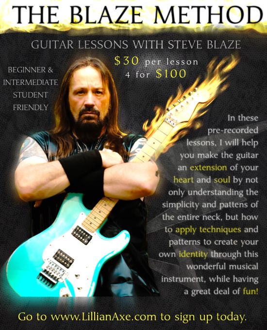 When you purchase a lesson, Steve makes himself available to respond to any questions via email and encourages students to send in their own compositions for advice. If you purchase 4 lessons, a phone or zoom call with Steve may be scheduled. The Blaze Method, is surprisingly priced very affordably, especially from a professional, seasoned musician and payment plans will be beginning soon. If you’re interested, go to LillianAxe.com for complete sign up information. Email Caren@LillianAxe.com with any questions.