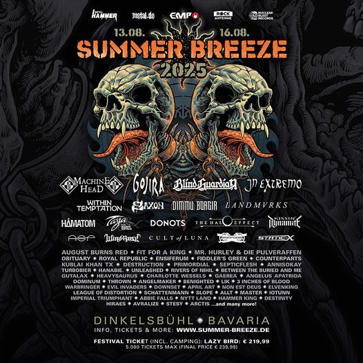 SUMMER BREEZE Open Air is a German metal music festival which takes place in Dinkelsbuehl, Bavaria annually. The first edition was in 1997. The festival had been held in Abtsgmuend until 2006 when it was moved to its new location of Dinkelsbuehl. The festival draws around 40,000 attendees annually. In 2017 a new main stage was introduced and the 20th Anniversary was celebrated extensively. SUMMER BREEZE pays special attention to a balanced line-up of bands from different heavy metal genres. Each year the festival attaches major importance to how the line-up is put together. From bands that are deeply rooted in the underground to genre representatives with the highest standing in the worldwide music scene SUMMER BREEZE Open Air is trying to present a diversified billing each year. Being aware of the significance of supporting younger bands the festival has began to lay emphasis on a growing (social) media coverage of the prospective heroes of tomorrow. With over 1000 different bands in the last two decades from around 20 different countries, there is a lot to experience at each edition of SUMMER BREEZE, and that´s a recurring promise and an honoured pledge.
