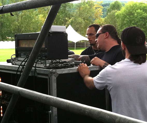 Dialing In Tones on Voodoo V-Rock DL100. From left to right – Mark Tremonti, Trace Davis and Anthony Cacciotti (09-09-2011)