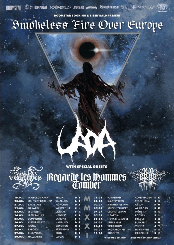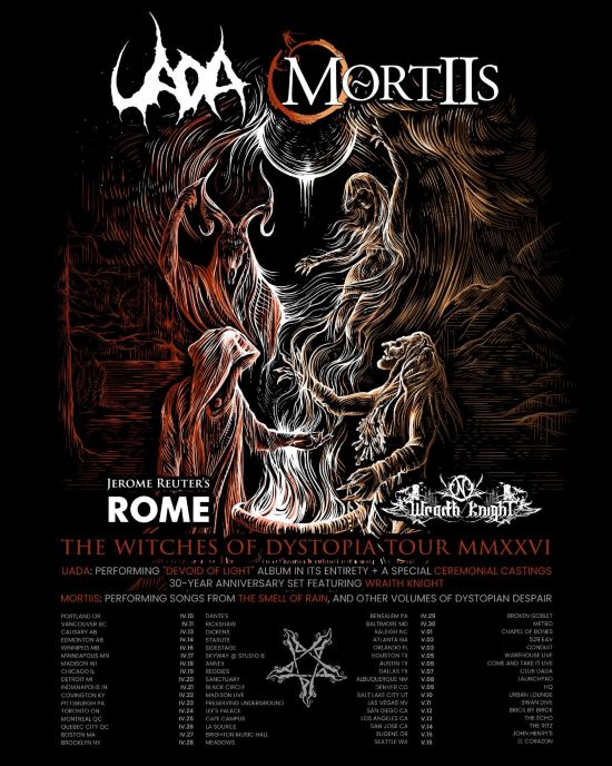 Enigmatic black metal horde UADA and industrial metal artist MORTIIS have teamed up for a very special co-headliner, featuring exclusive anniversary sets and supporting performances by Jerome Reuter’s ROME and WRAITH KNIGHT. UADA will be performing their seminal 2016 debut album ‘Devoid of Light’ in its entirety + a special CERMONIAL CASTINGS 30-year anniversary set featuring Wraith Knight. In addition, MORTIIS shall be performing songs from his groundbreaking 2001 full-length, ‘The Smell Of Rain,’ along with other volumes of dystopian despair.