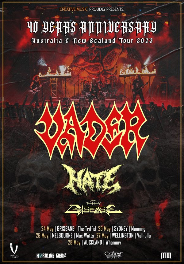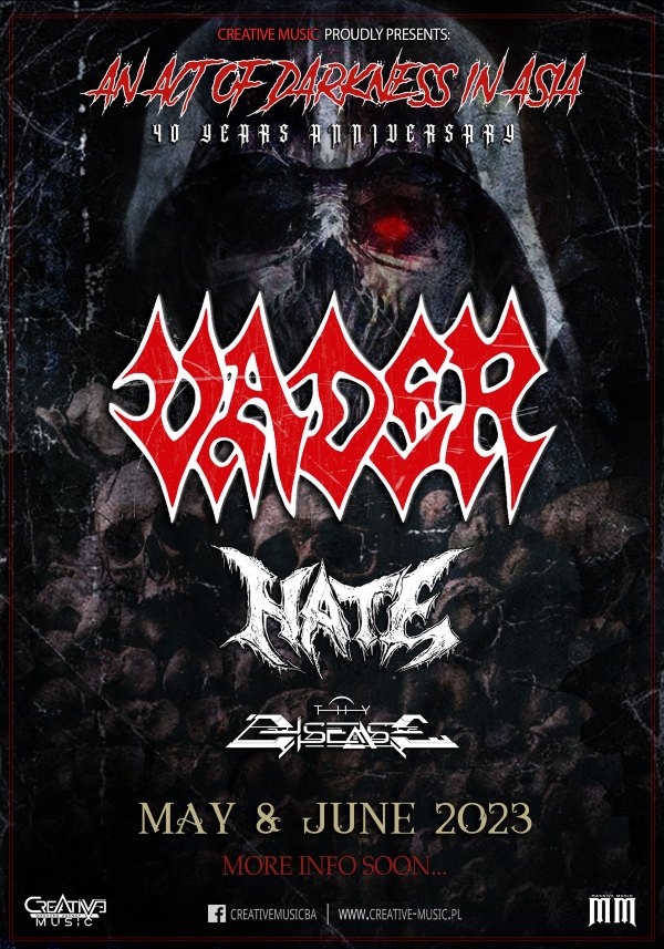 Polish death metal legends VADER – fresh from their successful “Revelation Of The Wicked – North American 2023” tour – have announced three more dates to the “An Act Of Darkness In Asia: 40th Years Anniversary Tour”, supported by HATE and THY DISEASE!