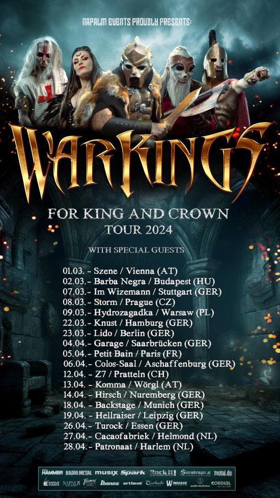 Today, WARKINGS also announced that labelmates HAMMER KING, VICTORIUS, DRAGONY as well as WINTERSTORM will join forces with them as direct tour support acts during their battles across Europe in Austria, Hungary, Germany, Czech Republic, Poland, France, Switzerland and the Netherlands. Check out the dramatic video, and grab your tickets while they last!