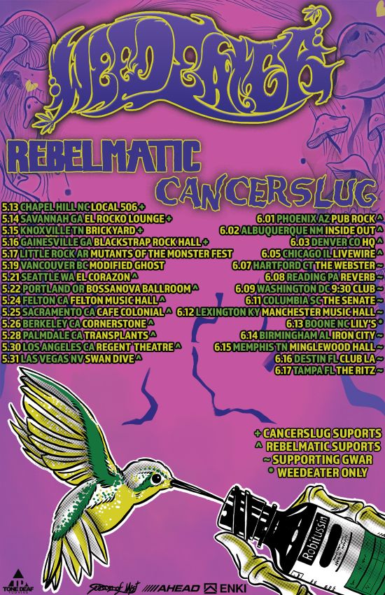 Joining in May for the first toke through Mutants Fest in the American South are Huntsville metal-punk miscreants Cancerslug. Next, Weedeater will descend upon the West Coast and then the Midwest with NYC’s notorious hardcore punk outfit Rebelmatic in tow. Then, as an added dab on the glowing cherry of this well-rolled tour, the band will return to the East Coast for 10 shows with the always iconic GWAR.