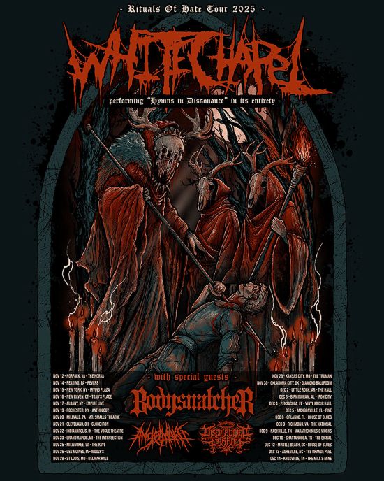 WHITECHAPEL will return to US stages next week on the Rituals Of Hate headlining tour. The journey makes its way through over two dozen cities from November 12th through December 14th and will see the band perform Hymns In Dissonance in its devastating entirety alongside some old favorites. Support will be provided by Bodysnatcher, Angelmaker, and Disembodied Tyrant. Find tickets and VIP upgrades at: whitechapel.soundrink.com